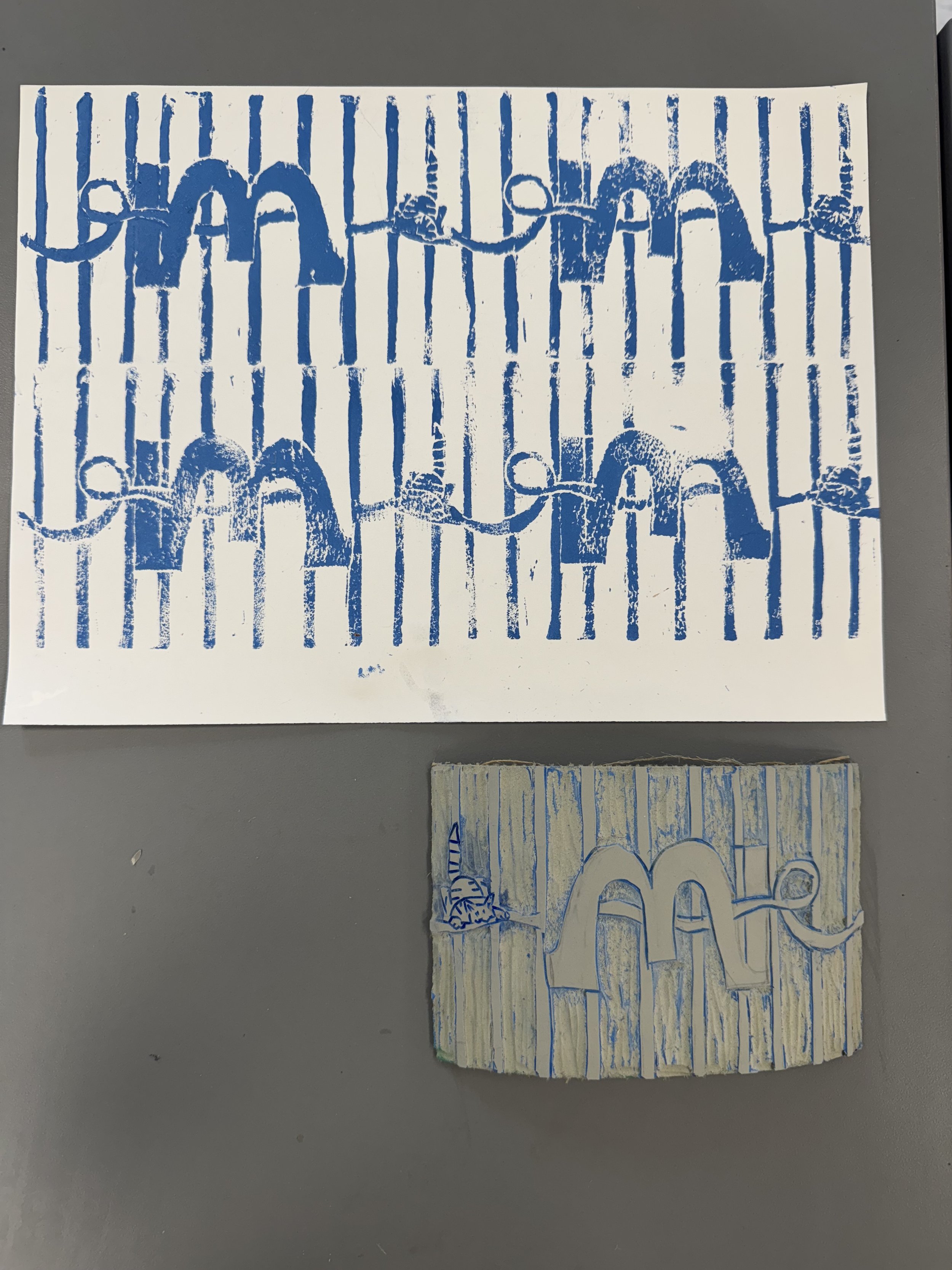 For this experience, my group and I created a printmaking lesson for the AP students of University High School to participate in. Students focused on making repeating patterns using linocut printmaking. Learners created prints and used fabric ink to create a wallpaper-like pattern on a provided tote bag. The patterns interlocked with one another creating a continuous design along their chosen material. By the end of the lesson, students left with their artwork as well as this reusable stamp to use outside the classroom.